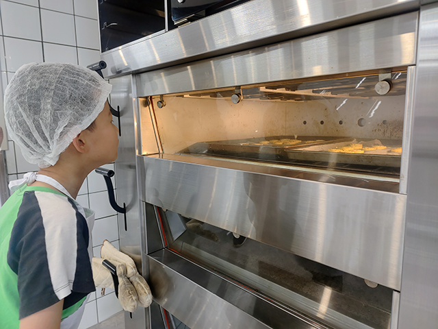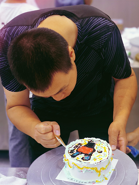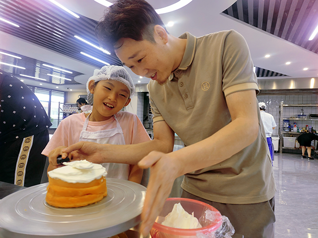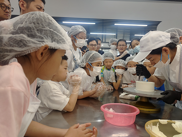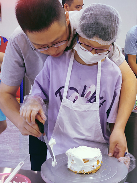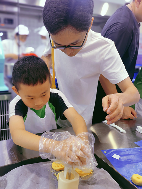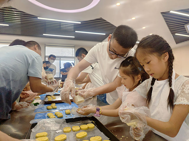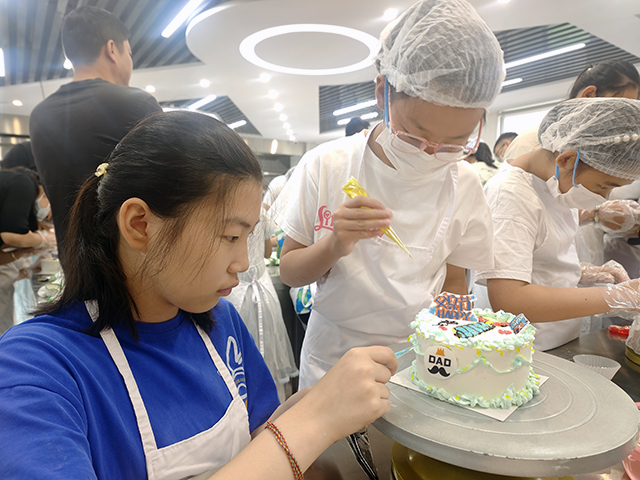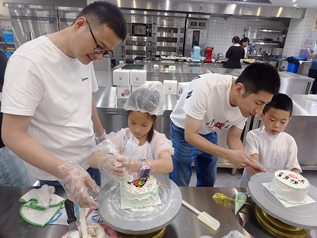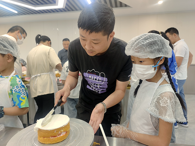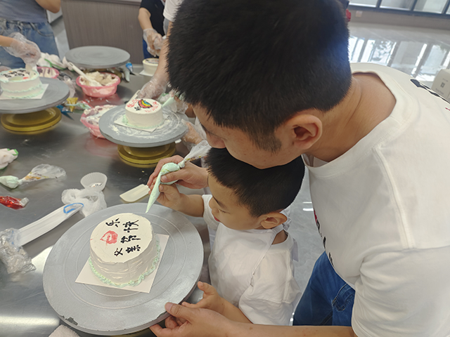 随后,在企业专业人员的指导下,学员与父亲亲密合作,相互配合,通过压磨具、烘烤、抹奶油、裱花装饰......不一会儿,象征端午习俗的绿豆糕和代表感恩之情的父亲节专属蛋糕便制作完成。在自己动手,共同分享的过程中,学员们收获了快乐,父亲们也感受到了陪伴的幸福感。