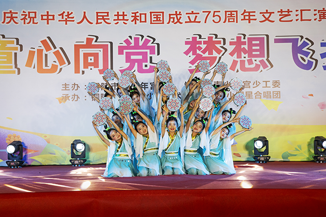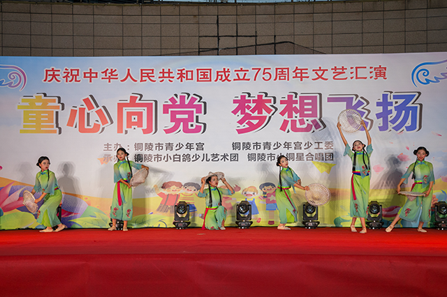 为庆祝中华人民共和国成立75周年,展示我宫教育教学成果和学员风采,在团市委、市少工委的关心指导下,近日,由铜陵市青少年宫、铜陵市青少年宫少工委主办,铜陵市小白鸽少儿艺术团、铜陵市小铜星合唱团承办的“童心向党 梦想飞扬”庆祝中华人民共和国成立75周年文艺汇演圆满举行。来自舞蹈班、声乐班、电子琴班、武术班、戏曲班等20个节目,330余名学员参加了演出。形式多样、内容丰富的节目表演吸引了众多市民及家长现场观看。