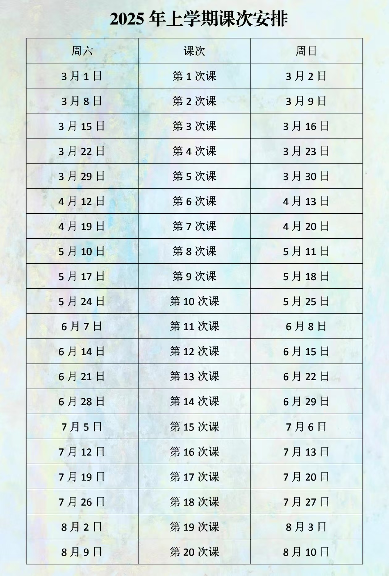 2025年3月1日(或2日)—2025年8月9日(或10日),共20次课。