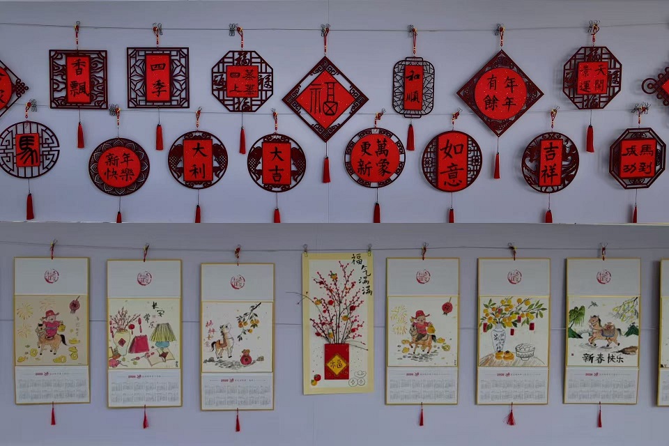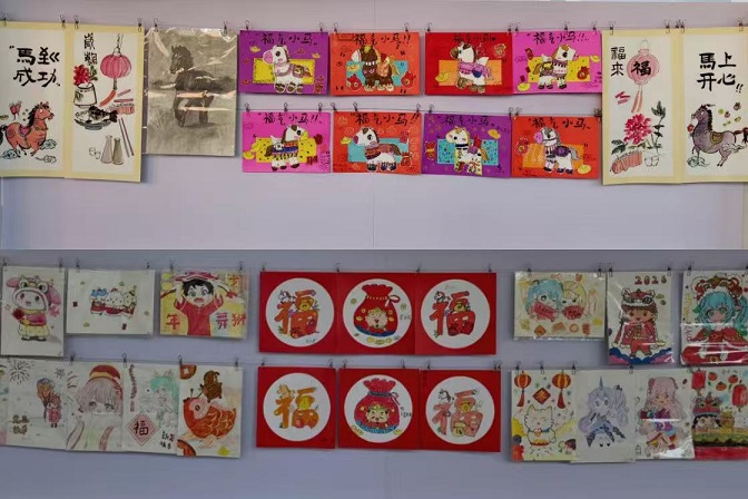 中国画展区更是韵味十足,在水墨渲染下,有傲雪绽放的红梅,有灯笼高挂、爆竹声声的庭院小景,也有围炉守岁的温馨场面,色彩晕染间满是对新年的美好期许。