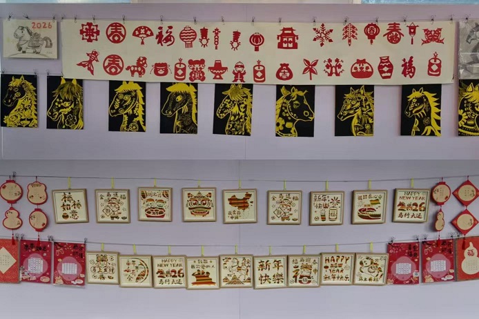 剪纸作品区,一张张红纸在孩子们指尖流转,转瞬幻化为栩栩如生的窗花、福字、雪花、小马等纹样,对称的镂空纹样既传统又充满童真创意,在剪刀的开合间化作一幅幅喜庆的新年画卷,将中国民间艺术的质朴之美与新年红火喜庆的氛围完美融合。