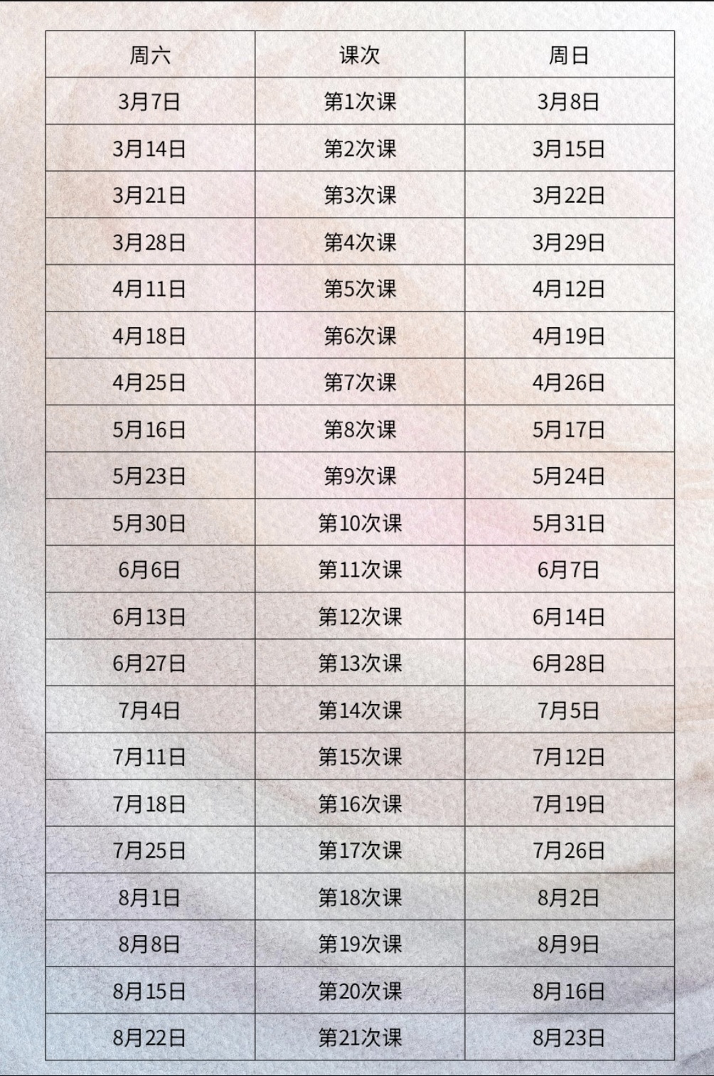 2026年3月7日(或8日)—2026年8月22日(或23日),共21次课。