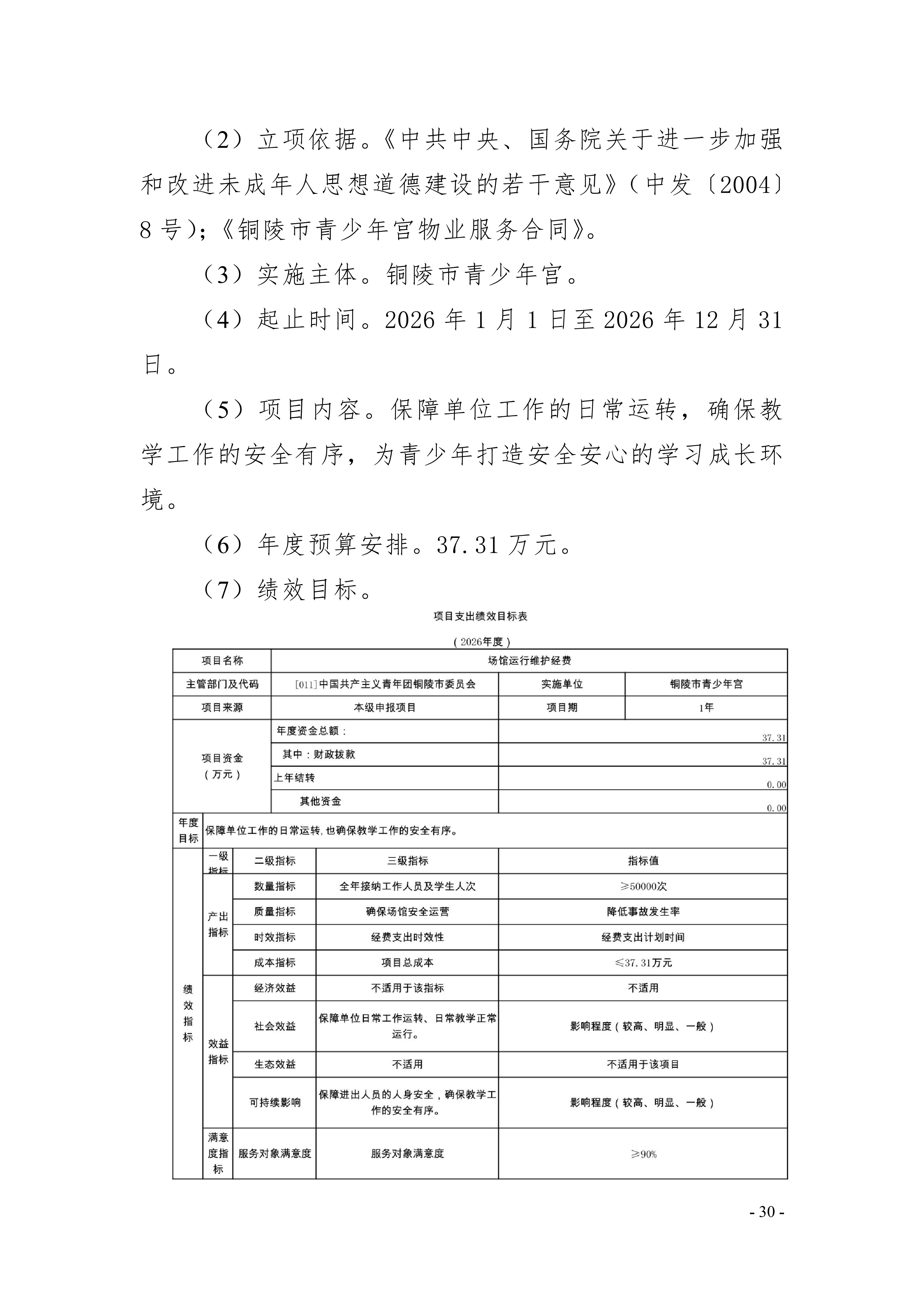 铜陵市青少年宫2026年度项目支出绩效目标
